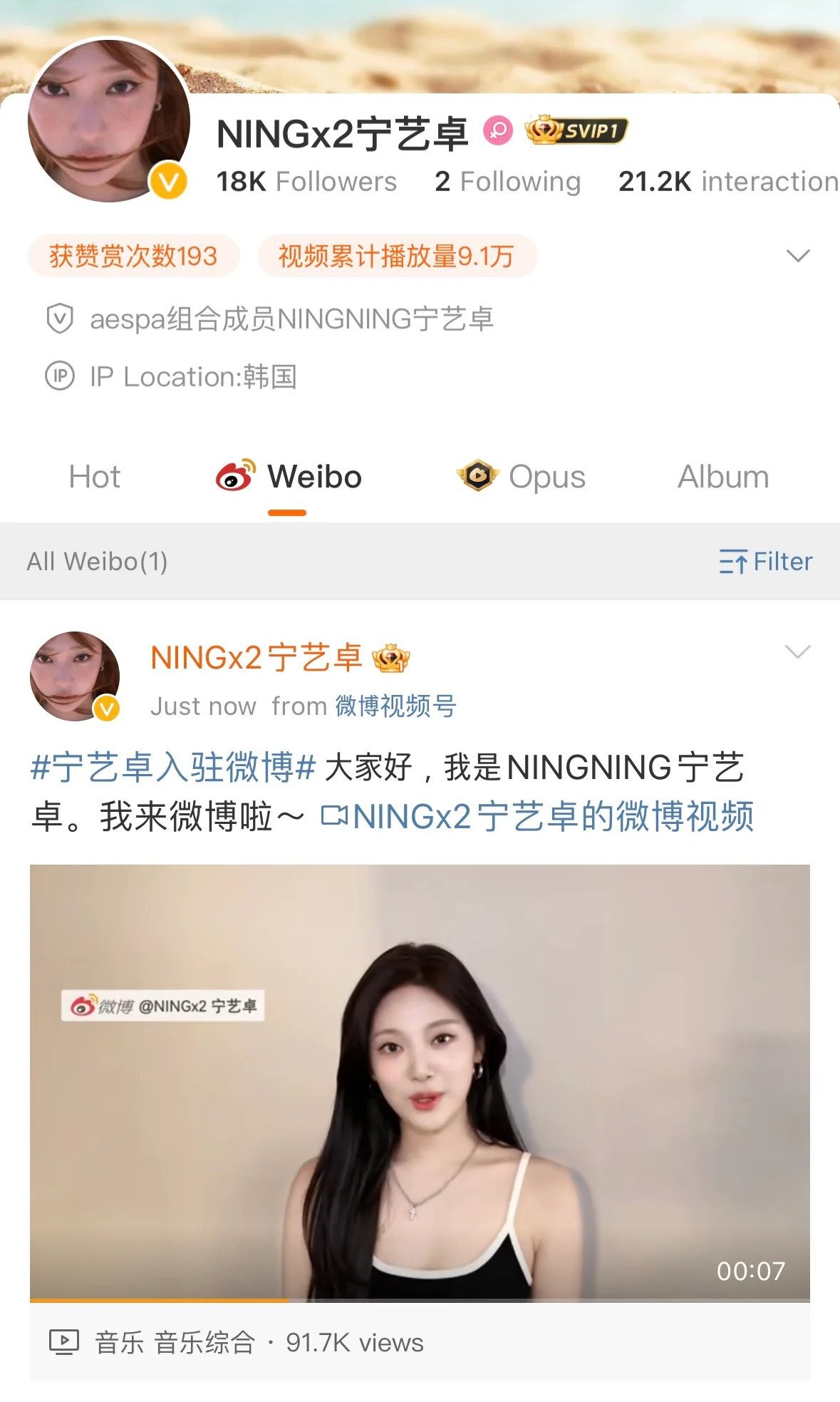 중국멤버 닝닝이 개인 웨이보 페이지를 개설했습니다